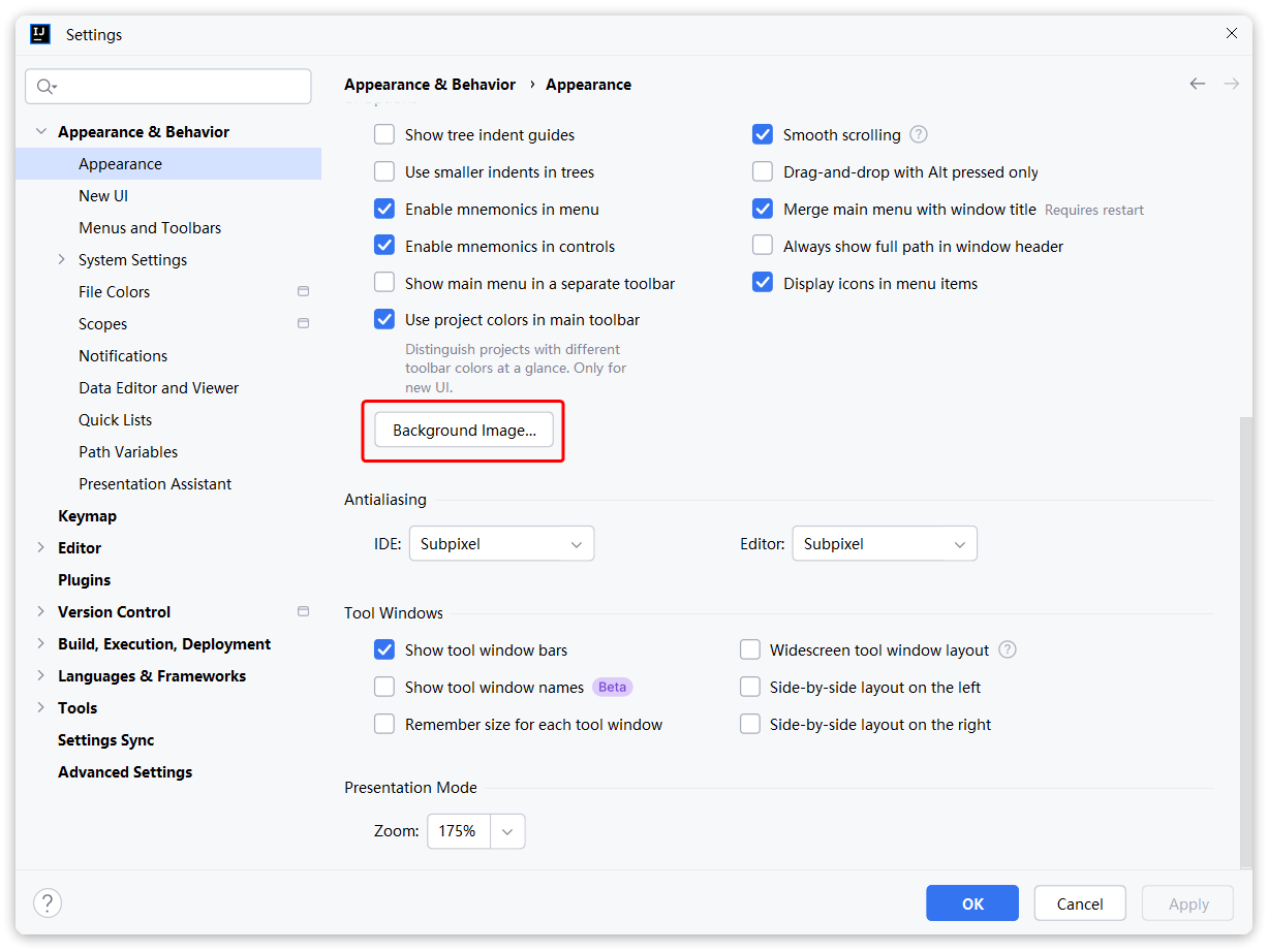 如果你觉得纯黑或纯白太单调,IDEA支持自定义背景图片。不过要注意的是,目前背景图片设置是灰色的,需要进入开发界面后,再次进入设置,才可以设置背景:
