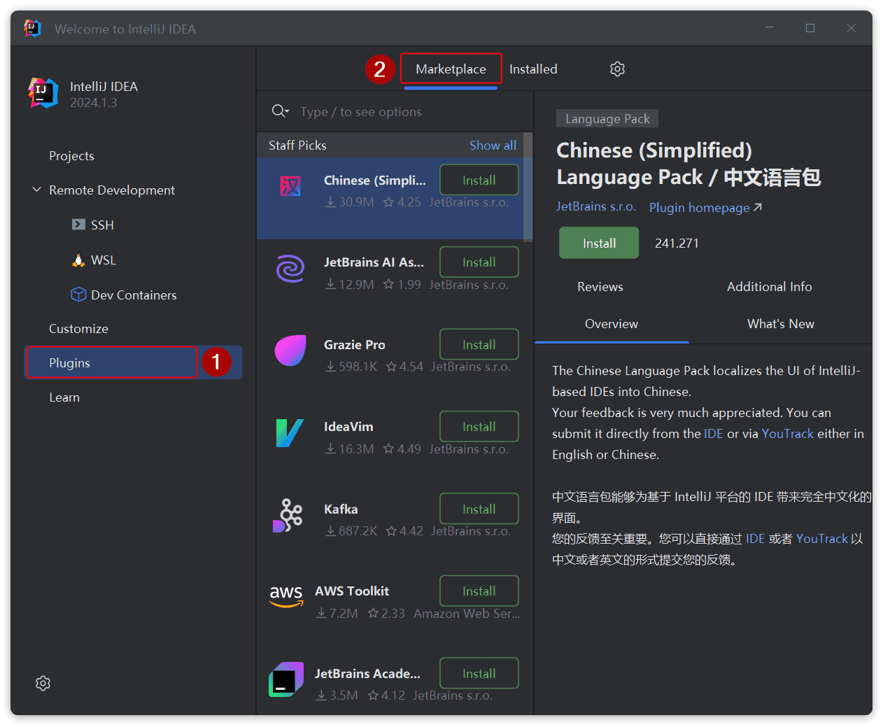 在插件管理界面的Marketplace中搜索:translation,找到第一个,点击install